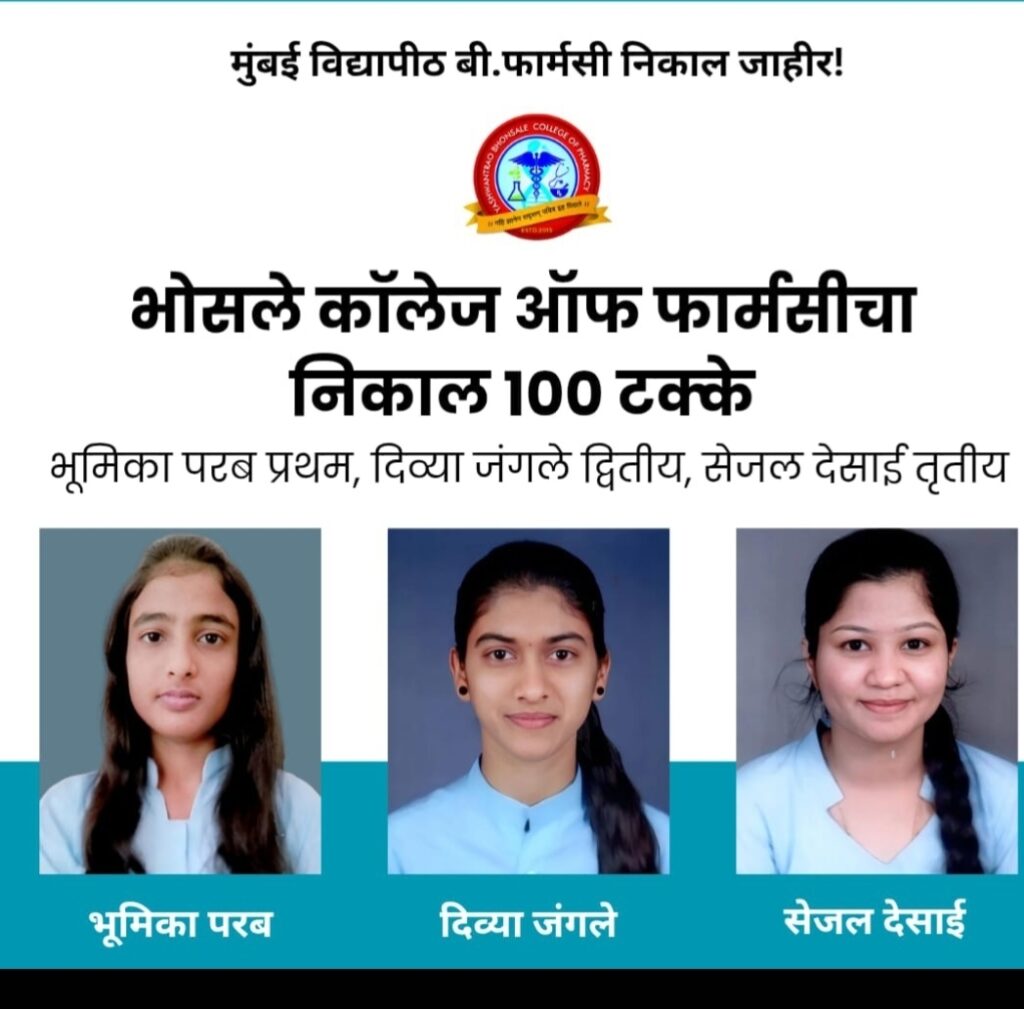 सावंतवाडी,दि.३०: मुंबई विद्यापीठाच्या बी.फार्मसी अंतिम वर्ष परीक्षेचा निकाल नुकताच जाहीर झाला असून यशवंतराव भोसले कॉलेज ऑफ फार्मसीने १०० टक्के निकालाची परंपरा यंदाही कायम ठेवली आहे. परीक्षेला कॉलेजचे एकूण १२६ विद्यार्थी बसले होते. त्यापैकी सर्वच्या सर्व उत्तीर्ण झाले. यात भूमिका मंगेश परब हिने ९.०९ एसजीपीए गुणांसह प्रथम, दिव्या जनार्दन जंगले हिने ८.९१ गुणांसह द्वितीय तर सेजल दत्तात्रय देसाई हिने ८.६४ गुणांसह तृतीय क्रमांक मिळवला. विद्यार्थ्यांच्या या यशाबद्दल संस्थेचे कार्याध्यक्ष अच्युत सावंतभोसले, प्राचार्य डॉ.विजय जगताप, परीक्षा विभाग प्रमुख प्रा.नमिता नार्वेकर, प्रा.प्रणाली जोशी यांनी त्यांचे अभिनंदन केले व पुढील वाटचालीसाठी शुभेच्छा दिल्या.