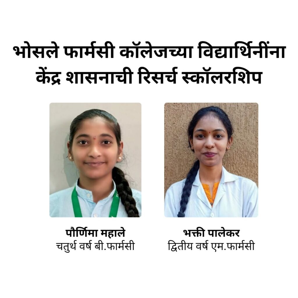 सावंतवाडी, दि.०८: तालुक्यातील यशवंतराव भोसले फार्मसी कॉलेजच्या दोन विद्यार्थिनींना केंद्र सरकारची रिसर्च स्कॉलरशिप जाहीर झाली आहे. बी.फार्मसी अंतिम वर्षात शिकणाऱ्या पौर्णिमा महाले आणि एम.फार्मसीच्या द्वितीय वर्षात शिकणाऱ्या भक्ती पालेकर या विद्यार्थिनींना अनुक्रमे तीन व सहा महिन्यांसाठी ही स्कॉलरशिप मिळाली आहे.