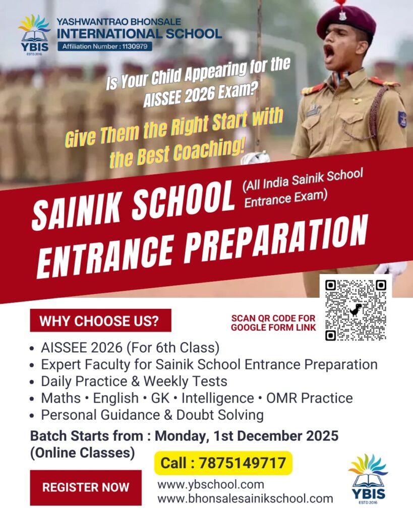 सावंतवाडी,दि.२८: यशवंतराव भोसले इंटरनॅशनल स्कूल, सावंतवाडी यांच्या वतीने AISSEE 2026 (ऑल इंडिया सैनिक स्कूल प्रवेश परीक्षा – इयत्ता सहावी) देणाऱ्या विद्यार्थ्यांसाठी विशेष मार्गदर्शन वर्ग सुरू करण्यात येत आहे. या उपक्रमाचा मुख्य उद्देश विद्यार्थ्यांना गुणवत्तापूर्ण प्रशिक्षण देऊन प्रवेश परीक्षेत यश मिळवून देणे हा आहे. यामध्ये अनुभवी व तज्ज्ञ शिक्षकांकडून ऑनलाईन पद्धतीने नियमित अध्यापन केले जाणार आहे.