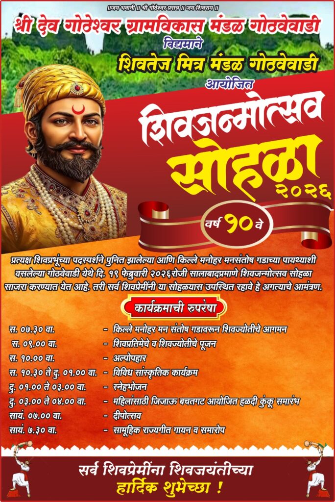 सावंतवाडी,दि.१७: किल्ले मनोहर मनसंतोष गडाच्या पायथ्याशी वसलेल्या शिरशिंगे येथील ऐतिहासिक गोठवेवाडी मध्ये दरवर्षीप्रमाणे यंदाही छत्रपती शिवाजी महाराज यांची जयंती मोठ्या उत्साहात साजरी करण्यात येणार आहे. श्री देव गोठेश्वर ग्रामविकास मंडळ आणि शिवतेज मित्र मंडळ, गोठवेवाडी यांच्या संयुक्त विद्यमाने १९ फेब्रुवारी २०२६ रोजी या भव्य ‘शिवजन्मोत्सव सोहळा’ कार्यक्रमाचे आयोजन करण्यात आले असून या उत्सवाचे हे १० वे वर्ष आहे.