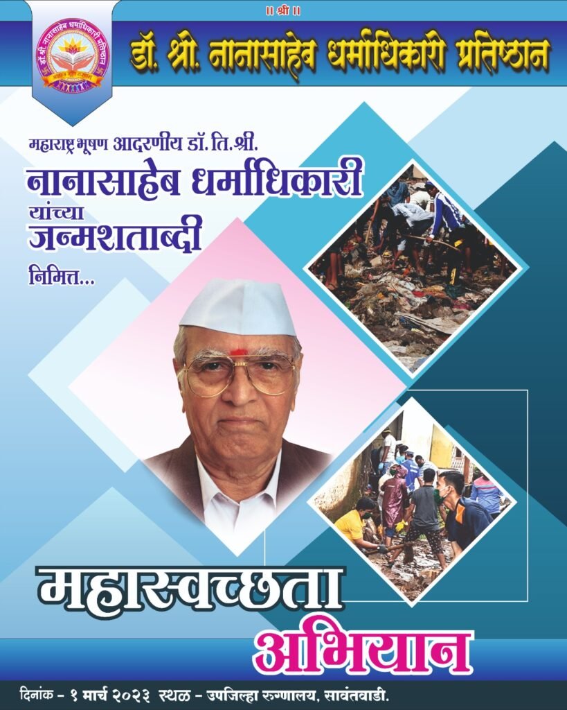 महाराष्ट्र भूषण डॉक्टर आदरणीय तीर्थस्वरूप नानासाहेब धर्माधिकारी यांच्या जन्मशताब्दी दिनानिमित्त या महास्वच्छता अभियानाचे आयोजन करण्यात आले असून उद्या बुधवार दिनांक १ मार्च रोजी सावंतवाडी उपजिल्हा रुग्णालय येथे डॉक्टर श्री नानासाहेब धर्माधिकारी प्रतिष्ठानच्या वतीने सकाळी सात वाजता स्वच्छता अभियान राबविण्यात आले आहे अशी माहिती राष्ट्रवादी काँग्रेसचे तालुकाध्यक्ष पुंडलिक दळवी यांनी आपल्या प्रसिद्ध पत्रकारातून दिली आहे.