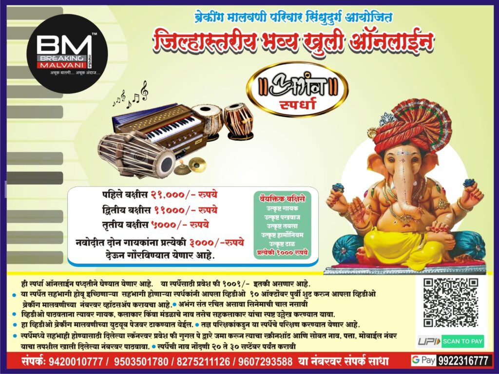 सावंतवाडी,दि.२०:खास गणेश चतुर्थीच्या पार्श्वभूमीवर ब्रेकींग मालवणी परिवाराच्या माध्यमातून जिल्हास्तरीय खुली ऑनलाईन अभंग स्पर्धेचे आयोजन करण्यात आले आहे.