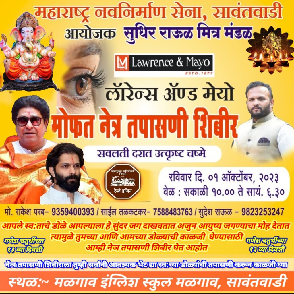 सावंतवाडी,दि.३०: येथील मनसैनिक सुधीर राऊळ यांच्या वाढदिवसाचे औचित्य साधून रविवार १ऑक्टोबर रोजी महाराष्ट्र नवनिर्माण सेना सुधीर राऊळ मित्रमंडळ आयोजीत व लाॅरेन्स ॲण्ड मेयो यांच्या संयुक्त विद्यमानाने मळगाव इंग्लिश स्कूल मळगाव येथे सकाळी १०ते संध्याकाळी ६.३० या वेळेत मोफत नेत्र तपासणी शिबिरचे आयोजन करण्यात आले आहे.