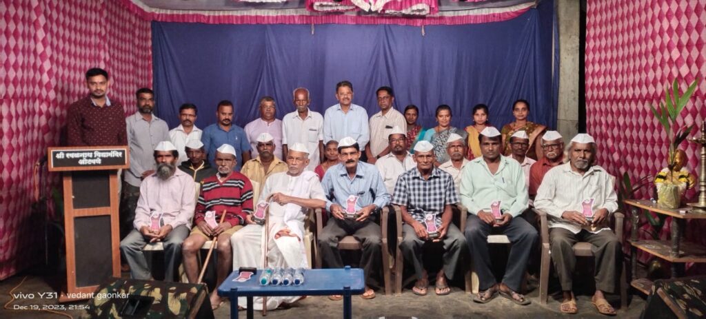 यावेळी शांताराम बिरोडकर, रामचंद्र (काका) सखाराम नाईक, बापू सदू गावकर, महादेव भोरू गावकर, धाकू रामचंद्र बोर्ये, शांताराम जयराम झारापकर, दत्ताराम विठ्ठल गावकर, बाबा महादेव चव्हाण, बापू बाबली गावकर, आत्माराम शिवराम गावकर, गोविंद शिवराम भिसे, गुंडू फटू तारी, रामचंद्र विष्णू सोनार, आना धोंडीराम गावकर, नरेंद्र लक्ष्मण कविटकर, श्रीम. आनंदी कृष्णा गावकर, नारायण यशवंत वर्णेकर या सर्वांचा आध्यत्मिकतेचे प्रतिक असलेली पांढरी टोपी, सुपारी रोपटे व सन्मानचिन्ह देऊन सत्कार करण्यात आला.
