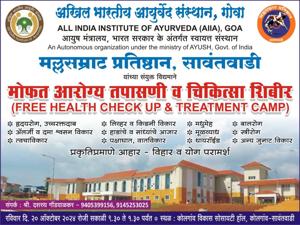 सावंतवाडी,दि.१७ : तालुक्यातील कोलगाव येथे २० ऑक्टोबर रोजी मोफत आरोग्य तपासणी व चिकित्सा शिबीर, तसेच मोफत औषधे उपलब्ध करण्यात येणार आहे. मल्लसम्राट प्रतिष्ठान, सावंतवाडी व अखिल भारतीय आयुर्वेद संस्थान, धारगळ – गोवा यांचे संयुक्त विद्यमाने कोलगाव विकास सोसायटी हॉल, कोलगाव, तालुका सावंतवाडी येथे