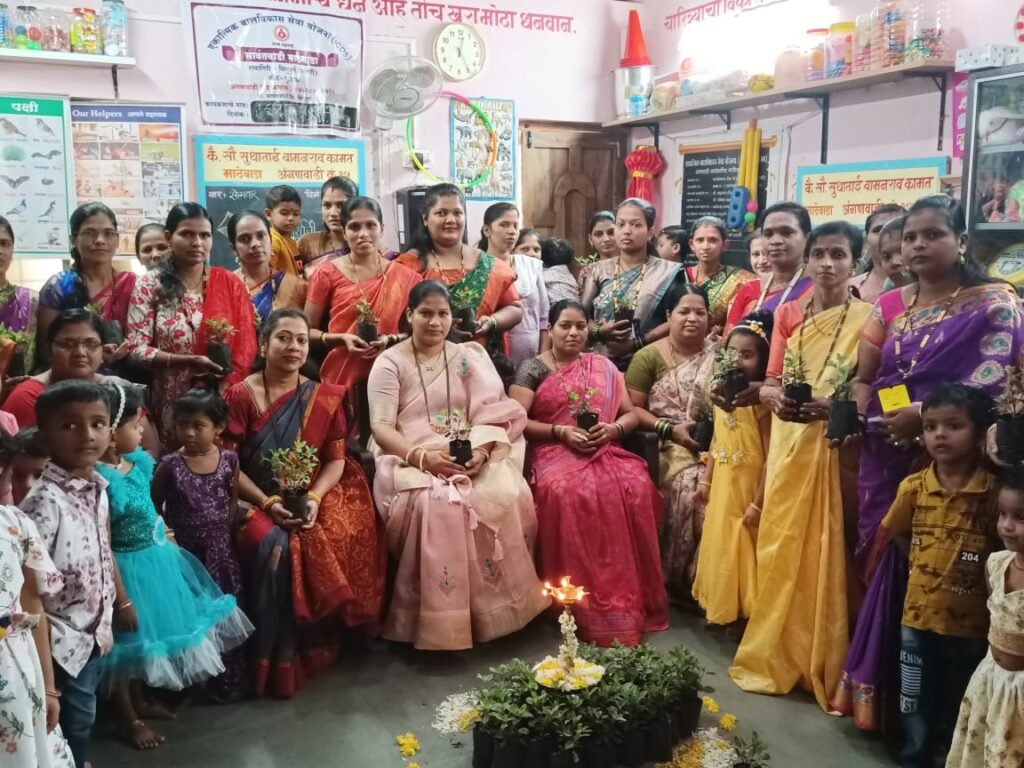 यावेळी हळद-कुंकू लावून तुळशीचे रोप सर्व महिलांना अंगणवाडी सेविका अनुराधा पवार यांच्या हस्ते देण्यात आले. यावेळी अंगणवाडी मदतनीस अमिषा सासोलकर, प्रशालेच्या मुख्याध्यापिका भक्ति फाले , शिक्षिका प्राची ढवळ, पूजा ठाकूर ,भावना गावडे हेमांगी जाधव