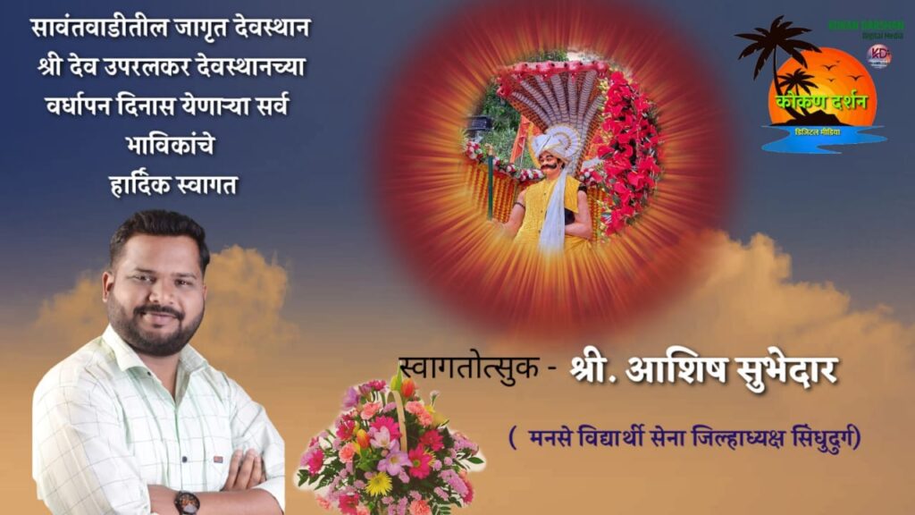 💐💐हार्दिक स्वागत💐💐 हार्दिक स्वागत💐💐 Kokan darshan 3 years ago सावंतवाडीतील जागृत देवस्थान श्री देव उपरलकर वर्धापन दिन सोहळ्यास येणाऱ्या सर्व भाविकांचे हार्दिक स्वागत स्वागतोत्सुक -श्री आशिष सुभेदार . (मनसे विद्यार्थी सेना जिल्हाध्यक्ष सिंधुदुर्ग)