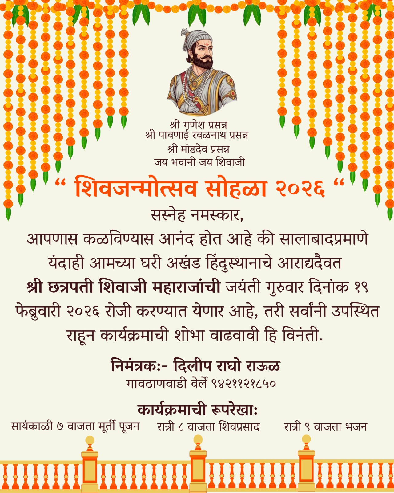 सावंतवाडी,दि.१८: अखंड हिंदूस्थानाचे आराध्यदैवत श्रीमंत छत्रपती शिवाजी महाराज यांच्या जयंतीनिमित्त दरवर्षीप्रमाणे यंदाही वेर्ले येथील गावठणवाडी येथे ‘शिवजन्मोत्सव सोहळा २०२६’ चे अत्यंत उत्साहात आयोजन करण्यात आले आहे. दिलीप राघो राऊळ यांच्या निवासस्थानी गुरुवार, दिनांक १९ फेब्रुवारी २०२६ रोजी हा सोहळा संपन्न होणार असून, या निमित्ताने विविध धार्मिक व सांस्कृतिक कार्यक्रमांचे आयोजन करण्यात आले आहे.