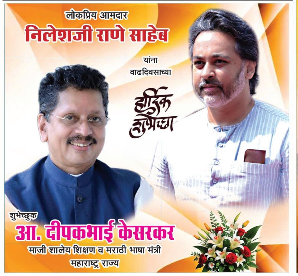 Newsटेकठळक घडामोडीराजकीयवाढदिवससंघटनासावंतवाडीसिंधुदूर्ग कोकणच्या विकासाचा बुलंद आवाज.! आमदार श्री निलेश राणे वाढदिवस अभिष्टचिंतन By Kokandarshan - March 17, 2026 0 6 FacebookTwitterPinterestWhatsApp कोकणच्या विकासाचा बुलंद आवाज! जनसामान्यांच्या प्रश्नांसाठी सदैव तत्पर असणारे, धडाडीचे कार्यसम्राट माजी खासदार आणि विद्यमान आमदार श्री. निलेशजी राणे यांना वाढदिवसाच्या अनंत शुभेच्छा! शुभेच्छुक: श्री दीपकभाई केसरकर( आमदार सावंतवाडी विधानसभा मतदारसंघ)