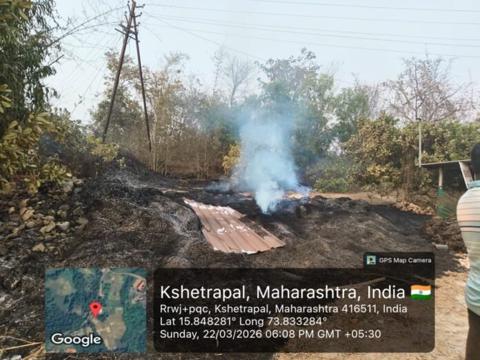 इन्सुली माडभाकरवाडी येथे विद्युत वाहिनी तुटून गवताच्या गंजी खाक; नितीन राऊळ यांच्या आक्रमक भूमिकेनंतर शेतकऱ्याला जागीच नुकसान भरपाई