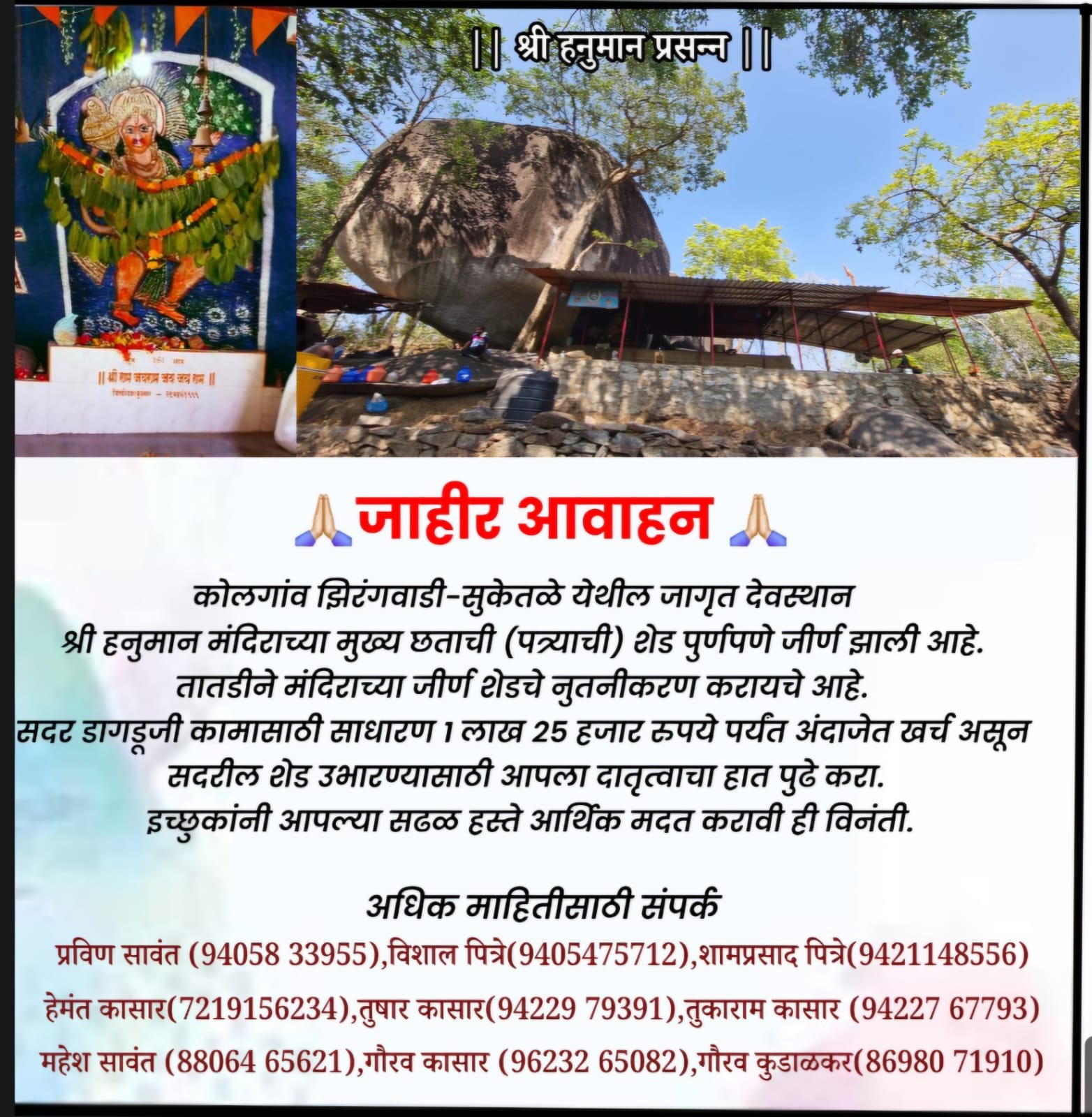 ज्या भक्तांना या सत्कार्यात खारीचा वाटा उचलण्याची इच्छा आहे, त्यांनी प्रविण सावंत (94058 33955), विशाल पित्रे (9405475712), शामप्रसाद पित्रे (9421148556), हेमंत कासार (7219156234), तुषार कासार (94229 79391), तुकाराम कासार (94227 67793), महेश सावंत (88064 65621), गौरव कासार (96232 65082) किंवा गौरव कुडाळकर (86980 71910) यांच्याशी संपर्क साधून सढळ हस्ते मदत करावी, जेणेकरून या भक्तीच्या केंद्राला पुन्हा पूर्वीची झळाळी मिळेल.