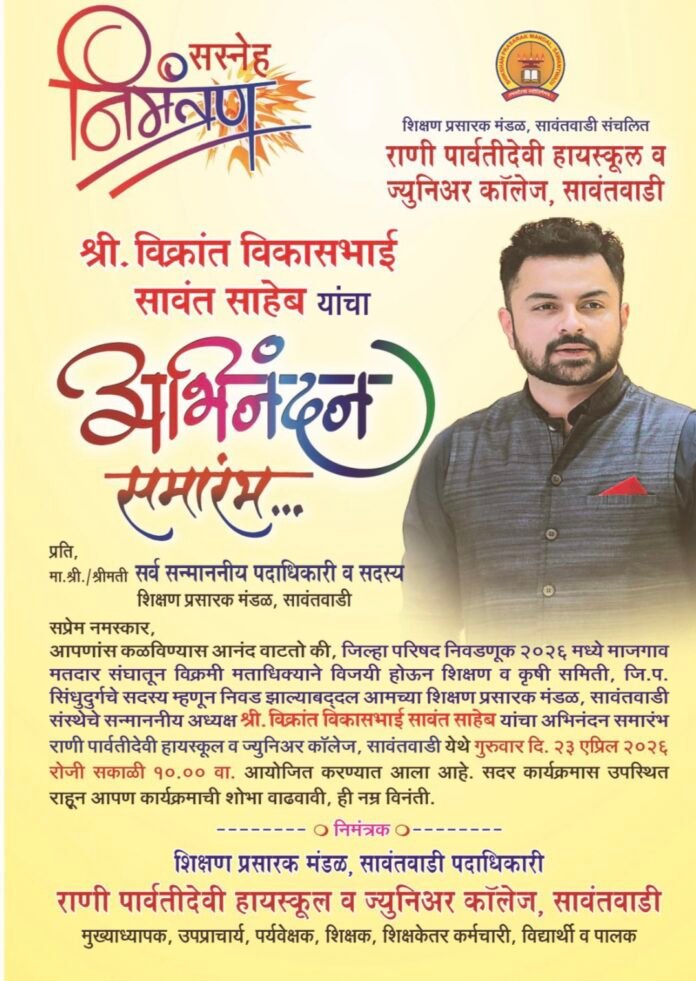 सावंतवाडी,दि.२३: जिल्हा परिषद निवडणूक २०२६ मध्ये माजगाव मतदार संघातून विक्रमी मताधिक्याने विजयी होऊन सिंधुदुर्ग जिल्हा परिषदेच्या शिक्षण व क्रीडा समिती सदस्यपदी निवड झाल्याबद्दल, श्री. विक्रांत विकास सावंत यांचा शिक्षण प्रसारक मंडळ, सावंतवाडी या संस्थेच्या वतीने विशेष अभिष्टनंदन सोहळा आयोजित करण्यात आला आहे. संस्थेचे अध्यक्ष म्हणून कार्यरत असलेल्या श्री. सावंत यांच्या या यशाचा गौरव करण्यासाठी आज, गुरुवारी या कार्यक्रमाचे आयोजन करण्यात आले आहे.