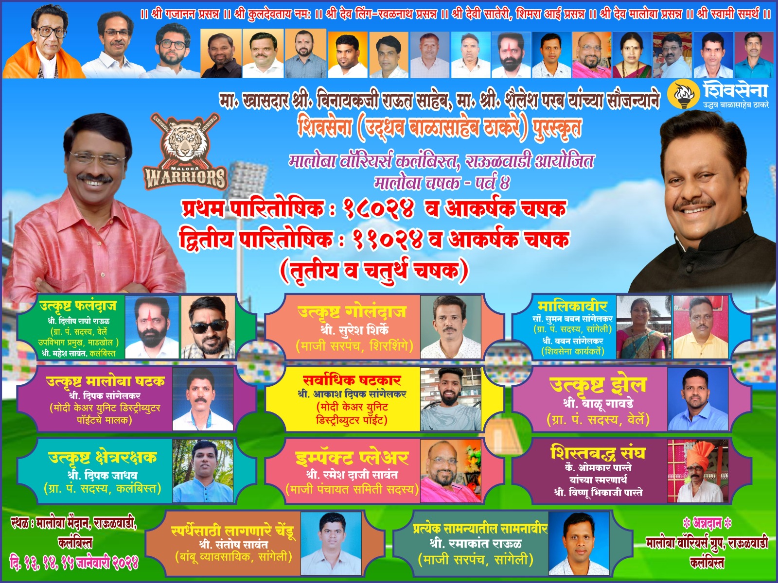 तरी सर्व संघ मालकांनी आपला संघ वेळेत घेऊन उपस्थित राहावे असे आवाहन श्री देव मालोबा वारियर्स ग्रुप यांनी केले आहे.