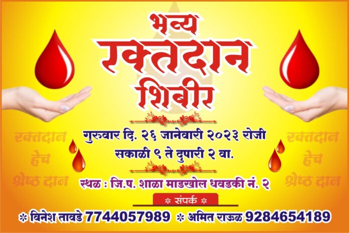 सावंतवाडी, दि.२५ : तालुक्यातील माडखोल धवडकी येथे प्रजासत्ताक दिनाचे औचित्य साधून रक्तदान शिबिराचे आयोजन करण्यात आले आहे.
